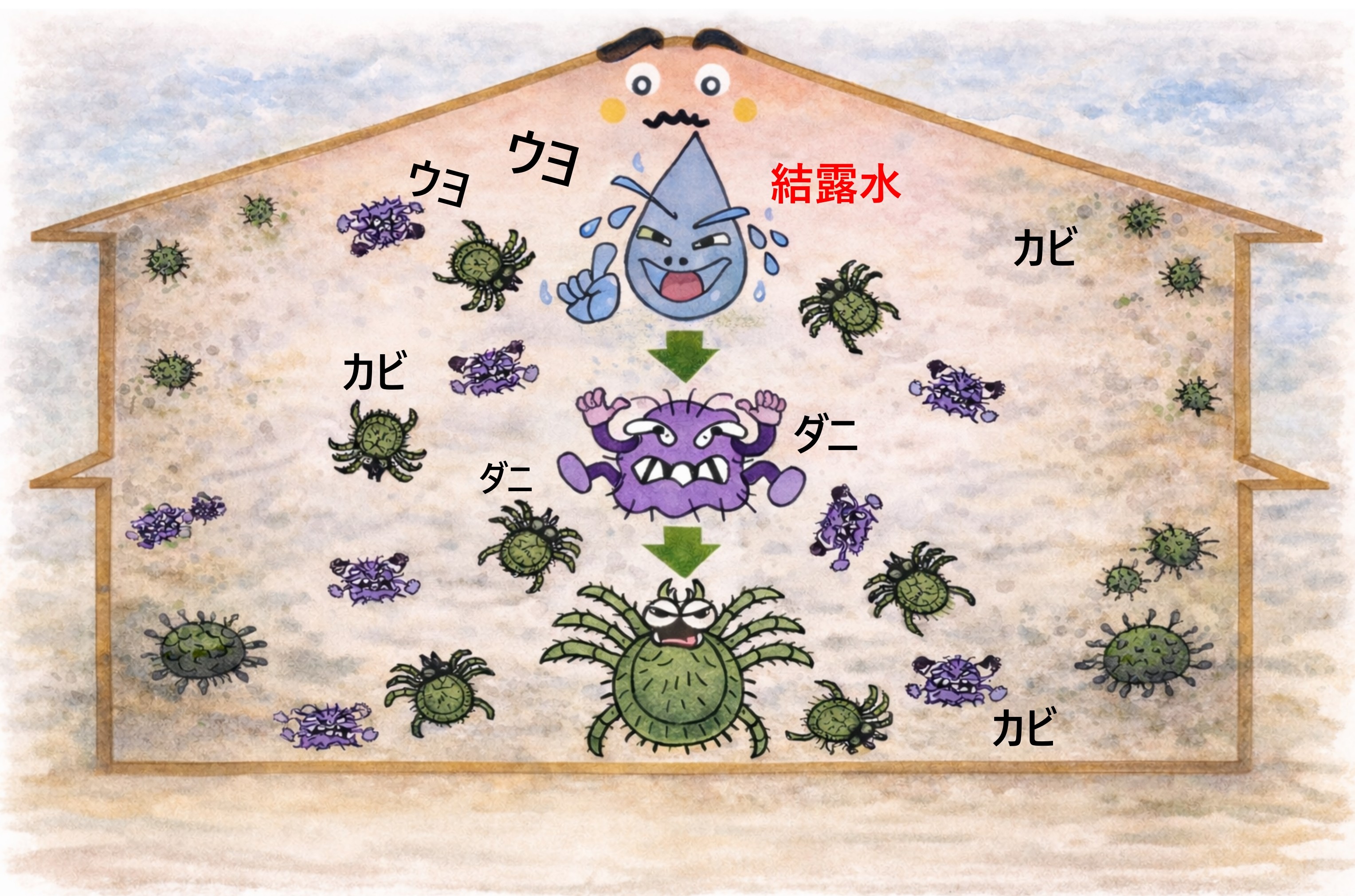 家の寿命を縮める大きな要因のひとつが、見えない水分、結露です。 壁の中や窓辺に潜む湿気は、カビやダニを育て、建物の耐久性を弱め、 そこに暮らす人の健康にも静かに影響を及ぼします。 結露は、冬の冷たい窓ガラスだけでなく、夏の猛暑や梅雨時の高湿度でも発生します。 まるで四季の中で陰陽が入れ替わるように、湿気は一年を通して姿を変えながら忍び寄ります。